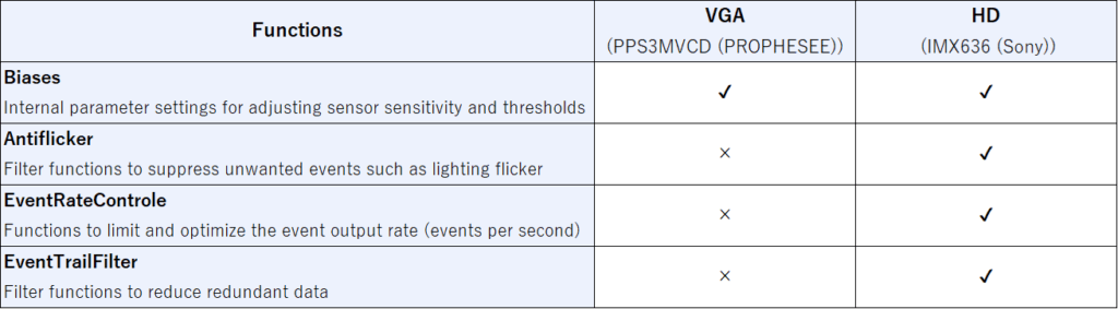 This comparison table is based on the use of metavision_studio within the Metavision SDK.